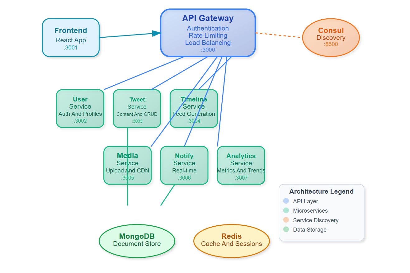 The Core Concept: Each microservice owns one specific business capability completely. The Tweet Service knows everything about creating, storing, and retrieving tweets. It knows nothing about user authentication. This isolation creates resilience - when one service fails, the others keep running.